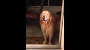 Un chien essaie de vous assurer que vous pouvez passer par une porte de balcon ouvert.