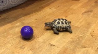Une tortue courir avec acharnement pour attraper une petite balle en plastique.