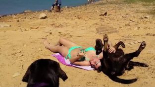 Sur une plage, une femme essaie de prendre le soleil, mais ludique labrador a d'autres plans.