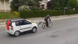 Dans une rue de la Croatie, un remorquage personnes âgées voiture endommagée, tirant un vélo.