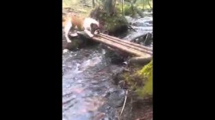 Luttes de Bulldog pour trouver une route sûre à travers une petite rivière.