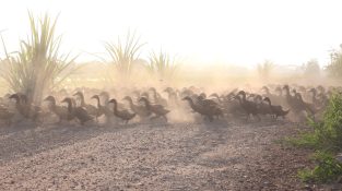 3.000 canards créent un nuage de poussière car ils traversent une route près d'un champ de riz, à Klong Sam Thaïlande.