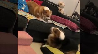 Deux chiens de race korgki ont développé une technique de combat très spécial, et se querellent à distance! Après quelques grognements, Les deux chiens font face sans se toucher.