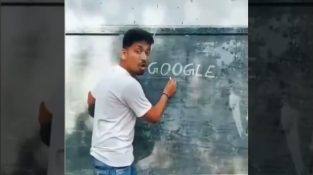 Une scène surréaliste très drôle, avec un homme méditant avec le kung-fu et une femme qui passe avec deux chiens.
