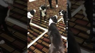 Un chien est inquiet, quand il voit son image sur deux miroirs.