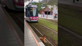 À Taiwan, un chien est allongé devant les voies du tramway. Participants, ils essaient de le retirer de la scène avec beaucoup de gentillesse et de patience.