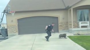 Un policier aux États-Unis, intervient pour arrêter un cochon domestique qui tente de s'échapper.