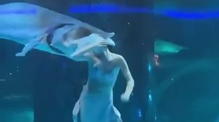 Un esturgeon dans un aquarium a tenté d'avaler une femme déguisée en sirène.
