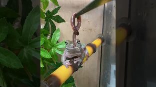 Une grenouille tombe alors qu'elle tente d'attraper un ver.