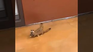 À la recherche de son petit, une belette vient le prendre avec elle en le tirant par l'oreille.