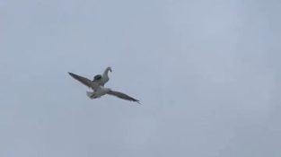 Une mouette prend une pause et se tient un moment sur une autre mouette, en l'utilisant comme planche de surf.