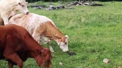 באחו, הפרות צופות בחפץ חשוד, צב. יש המנסים ללמוד קצת יותר את החיה המוזרה, אבל קרוב עגל אחד קרוב רק, הצב מגיב ולהפחיד את הצאן.