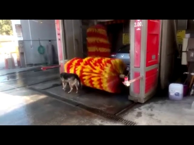 כלב משתמש מברשת גלילית רחבה בחבל לשטיפת מכוניות, לשטוף.