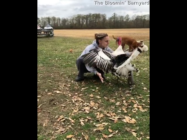 תרנגול הודו קופץ לתוך הידיים של האישה.