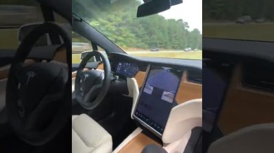 אלברט סיפלן, הבעלים של טסלה דגם X, מאפשר לרכב לנסוע באופן אוטונומי בכביש המהיר ליד הנדרסון, צפון קרוליינה. האיש יושב במושב הנוסע, בלי איש מאחורי ההגה, ומתעד את המסלול תוך כדי מעבר כלי רכב אחרים במהירות של כ-90 קמ'ש.