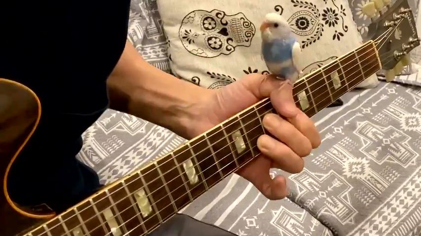 תוכי יושב על יד בעליו, בזמן שהוא מנגן על רוקנרול בגיטרה.