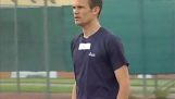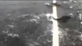 חתול מתגרה בחתול אחר שיושב מאחורי וילון.