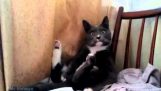 כלב צ'יוואווה מנסה לצעוק האזנת פעמון, אבל לא נראה להאמין.