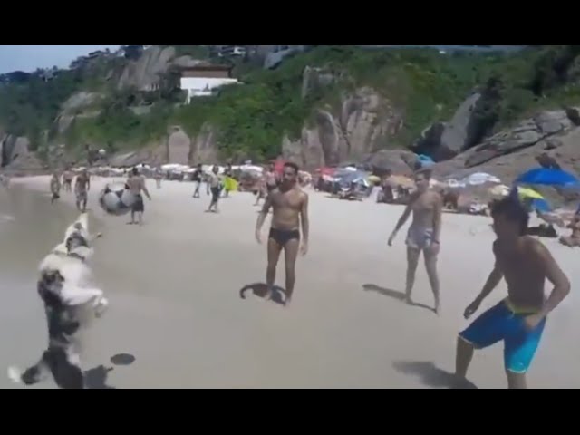 כלב לשחק כדורגל עם החברים שלו על החוף של ריו דה ז'נרו.