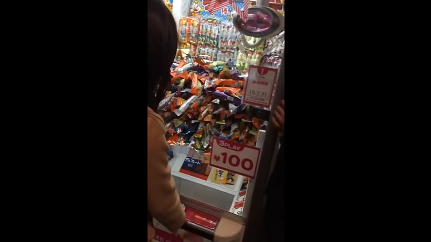 בחורה ביפן. משחק עם קליבר, על מכונת המציע עבור מתנות שוקולד.
