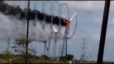 בחוות רוח ליד קוימבאטור הודו, טורבינת רוח באש עקב קצר. בעת סיבובו, אחד הלהבים של ספירלה ענקית של עשן לפני בסופו של דבר מתמוסס וגדלים.