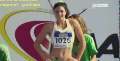 מתעמלת בת 19 חמוד מישל Jenneke מ- Astralia, אל ריקוד להתחמם לפני המרוץ 100 מטרים לעבר ליגת הנוער בעולם metempodion ברצלונה