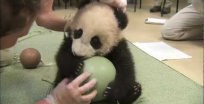 עובדים בגן החיות של סן דייגו נותנים כדור לילד בן 4 חודשים כשהם בוחנים אותו.