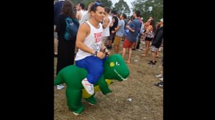 צופה רוקד בתלבושת מצחיקה בפסטיבל המוזיקה 'Northern Bass' בניו זילנד.