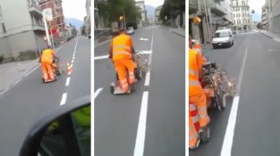 העיר של בקתה כפרית סונדריו, איטליה, פועל בניין כביש שיכללה האומנות של הכביש סימנים, באמצעות כיסא גלגלים ממונע.