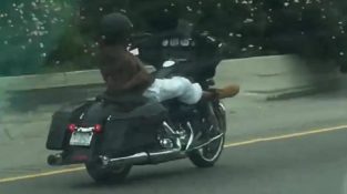 בעת I-10 המהיר ניו אורלינס, לואיזיאנה, רוכב אופנוע יושב גם בנוחות על החליקו ברחוב הרלי-דייווידסון. האיש זמון על האופנוע שלו, כפי שעשיתי משהו על הספה.