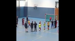 בשנת בית ספר לטניס, ילד רץ יריות ומנהלת לקלוע סל זמנית, עם כדור ואת נעל.