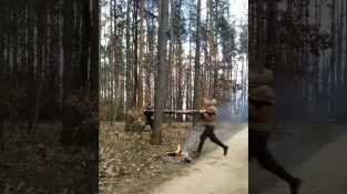 שני צעירים מפולין מנסה לשבור גזע עץ באמצע. הם לשמור על קצה אופקי מישהו הגוף, והם רצים לעץ...