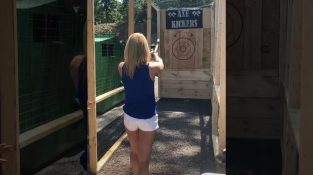 מטווח ירי בגרזן בסיאטל, ארה'ב, אישה מנסה לזרוק גרזן לעבר המטרה. הגרזן יעבור מספיק גבוה מעל המטרה, בסופו של דבר בחניון המטווח.