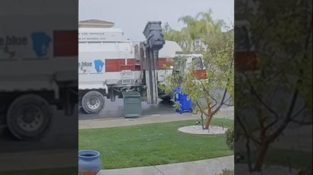 משאית זבל אוטומטית בקליפורניה, ארה'ב זורקת לפח שלם עם זבל, אבל משאיר את גלגליו מאחור.