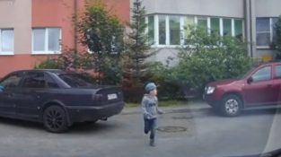 ילד קטן חוצה רחוב בלי להסתכל כמו שצריך משני הצדדים. התנגשות עם מכונית היא בלתי נמנעת...