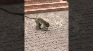 בפוקט, תאילנד, קוף פורש את הכישרון האמנותי שלה על ידי ציור מעגלים על האדמה באבן.