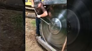 אדם מתקשה לפרוק את הדיסק ממסור עגול ענק. בסופו של דבר, דחפור ייתן את הפיתרון.