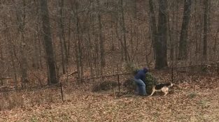 אדם מנסה לזרוק את עץ חג המולד שלו, אך שני כלביו אינם מסכימים.