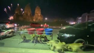 מאות מקוקים עוברים דרך כביש בלופבורי, תאילנד, כאשר זיקוקים מופעלים במקדש הקופים פראנג סאם יוד במהלך פסטיבל שנתי.
