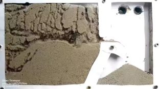 הפסקת הזמן של מושבה של נמלים החופר את קנן בפעם הראשונה בקרקע. שימו לב איך העובדים חופרים משמאל ומרוקנים את האדמה מימין.