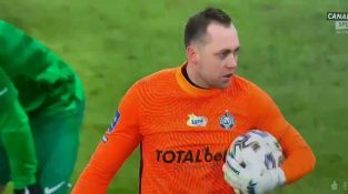 השוער אדריאן ליס מקבוצת ורטה פוזנן הפולנית, זורק את הכדור לקרקע מרוגז כשהוא עוזב את המגרש במחצית.