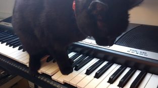 החתול מיצי מנגן מוסיקת סרטי אימה בסינתיסייזר.