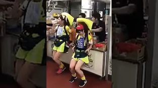 שתי מפיצי בנות במבשלת בירה ביפן, מלאים בחביות בירה שהם נושאים בתרמילים מיוחדים.