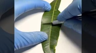 עלה מנגו במים במיקרוסקופ, מראה כיצד הוא מייצר חמצן על ידי שחרור בועות.