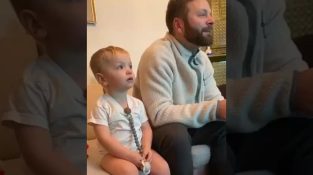 ילד קטן בן שנתיים צופה במשחק עם אבא שלו בטלוויזיה, אבל יש לו תגובה שגויה ברגע שהשער נכבש.