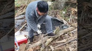 אדם חוטב עצים עם גרזן, כשלפתע הטלפון הנייד שלו נופל מהכיס.