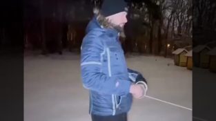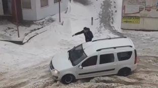 שני עוברי אורח אדיבים מוכנים לעזור לחבריהם, שנתקע עם המכונית שלו בשלג.