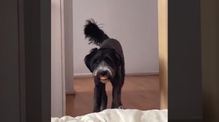 כאשר כלב זה נכנס לחדר השינה, היה עליו משהו יוצא דופן. מצא את התותבת המלאכותית של סבתא ושמר אותה בפיו.