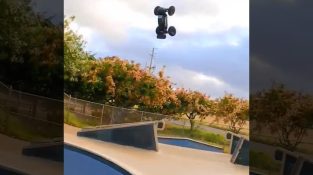 מכונית שלט רחוק של שלט רחוק שנשלט על ידי איש מקצוע מהסוג. חלק מהאקרובטיקה חותכים את הנשימה.