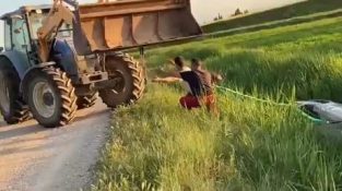ניסיון כושל של נהג טרקטור לגרור מכונית שנפלה לתעלה עמוקה.